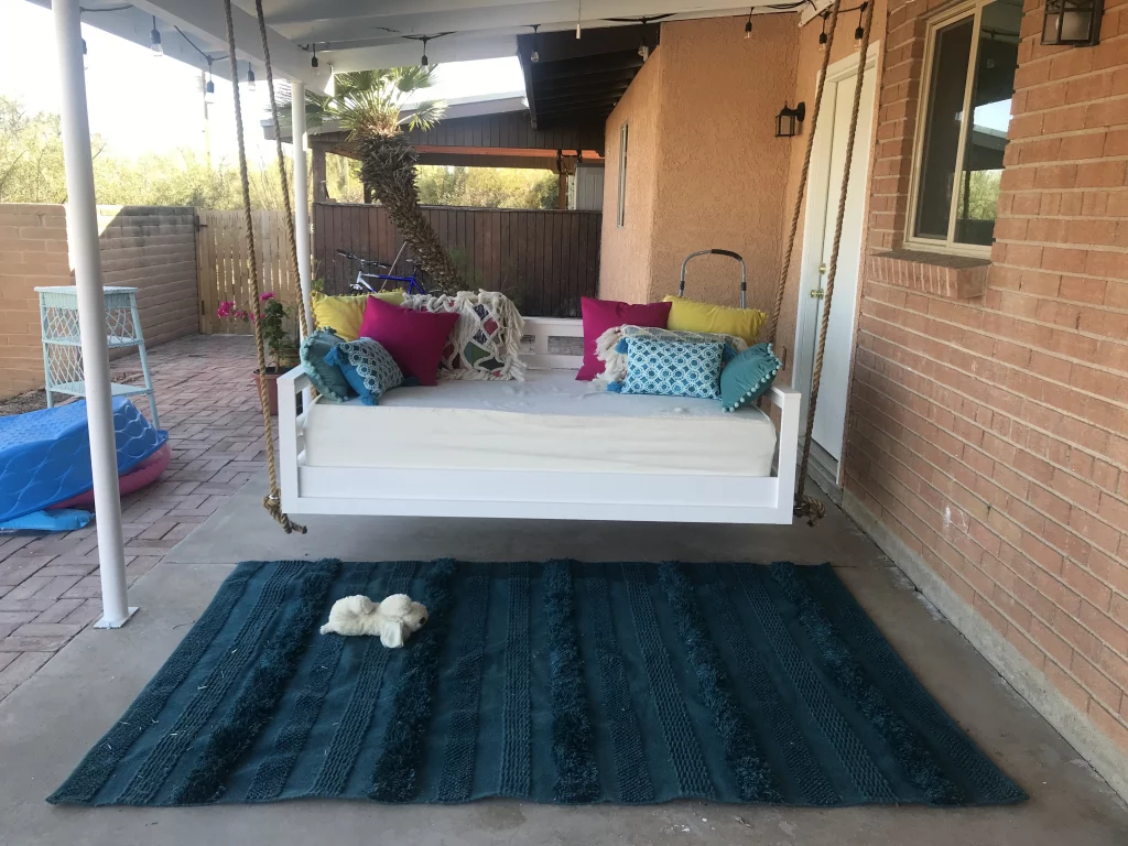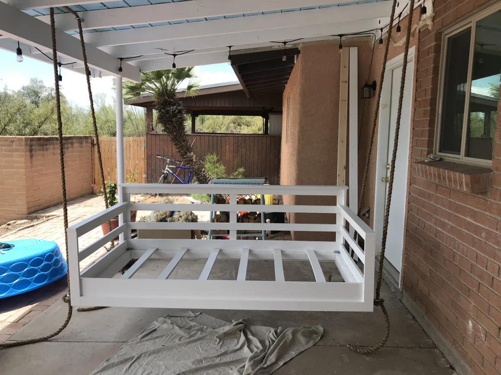 If you are interested in having this porch bed swing built for you so you can enjoy relaxing in comfort and enjoying the cool breeze, send me an e-mail at info@craftycanuckhandyman.com or text message at (404)-465-1782. The price is $800 and includes the frame, rope, hanging eye hooks, and your choice of color (mattress and mattress pad not included), and delivery for customers local to Roswell, Alpharetta, and Johns Creek. Shipping is not available.